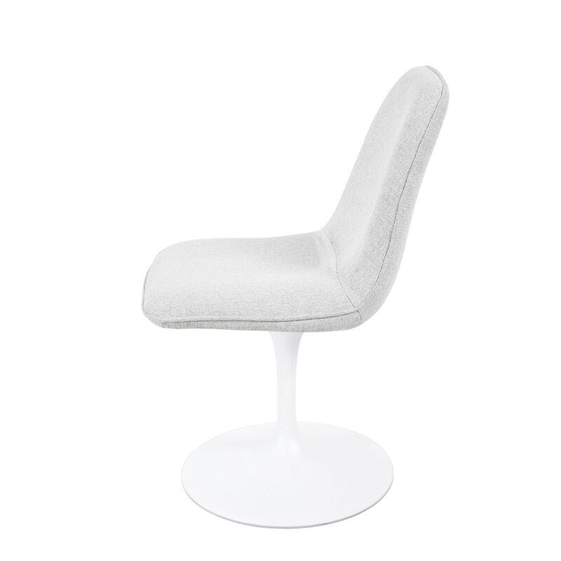 Draaistoel met gewatteerde zitting en rugleuning bekleed met lichtgrijs-witte stof, ronde witte metalen voet - LORA