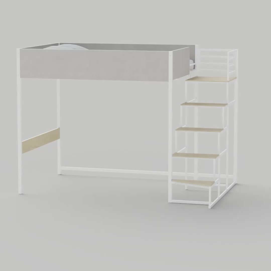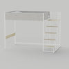 Lit mezzanine avec sommier et escalier réversible en tissu gris clair, métal blanc et mélamine chêne - couchage 140x190 cm - DOCKLAND