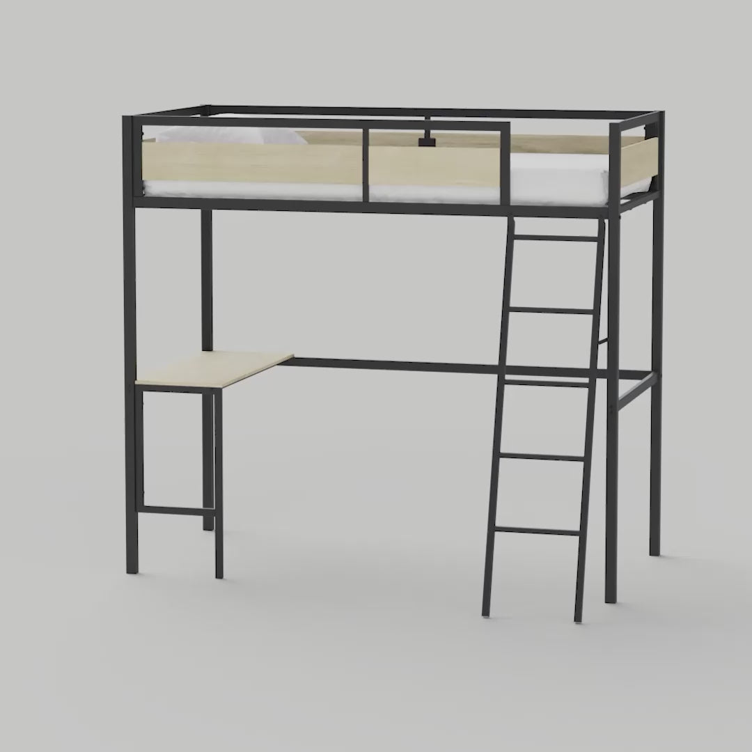 - Matériaux de qualité : la structure en métal confère robustesse et durabilité au lit, assurant une utilisation à long terme. Le bureau intégré est en finition mélamine imitation chêne, ajoutant une touche chaleureuse et naturelle à l'ensemble.